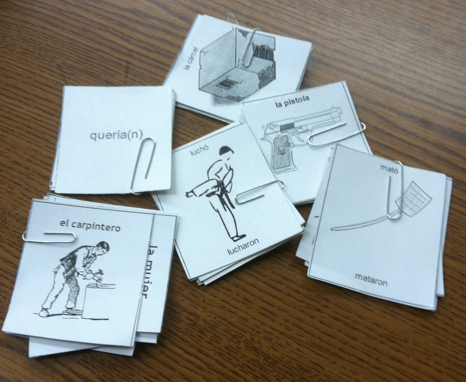 There’s not much to the game pieces, but there are several variations for how to play.  I started by creating cards with story elements in Spanish (characters, actions, descriptions, places).  They can be found here: